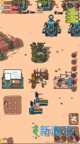 游戏刚开始时,点击右下角的建造按钮,建立基本的水源与食物建筑,保证队伍生存的基本需求。